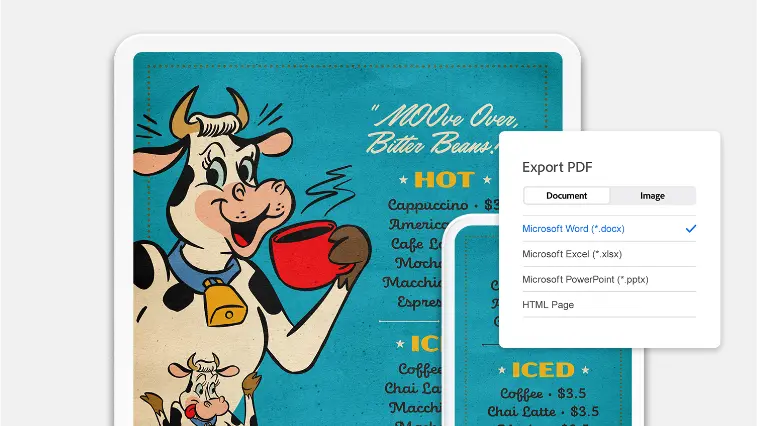 Convert your PDF into a different file type, including Microsoft Word, Excel, PowerPoint, and image formats like .jpeg and .png.